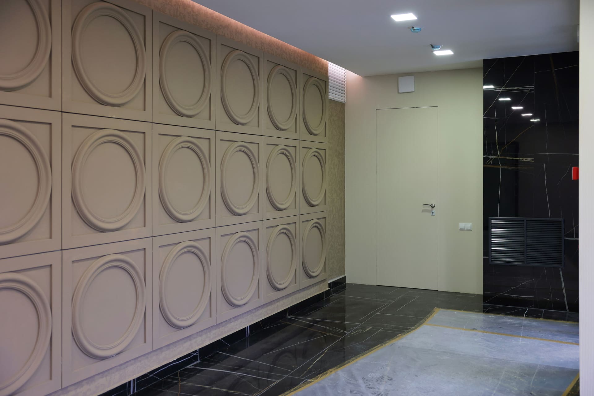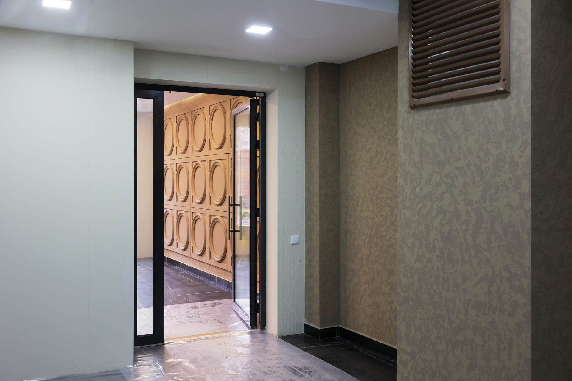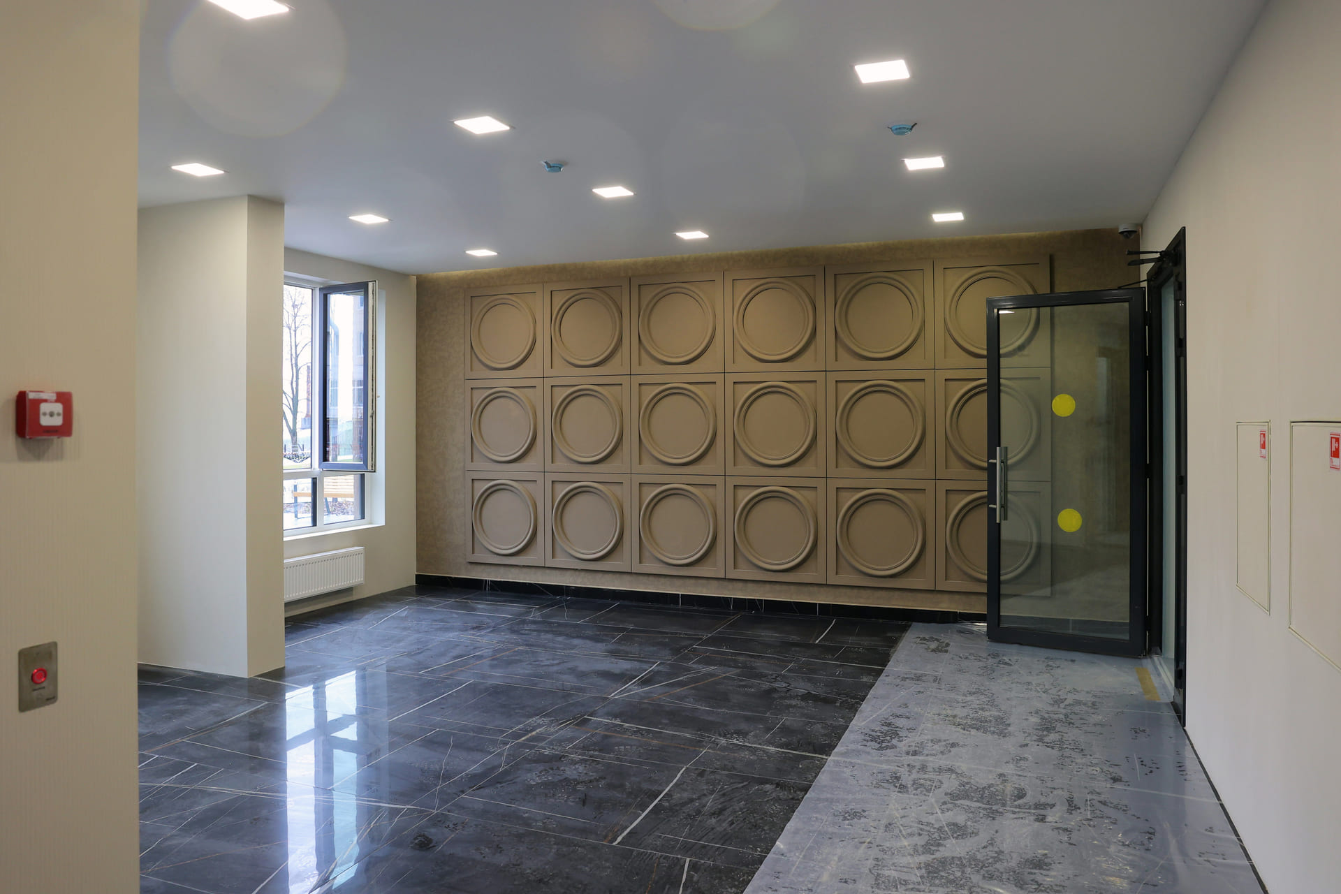 Просторные холлы с высокими потолками, витражными окнами и элегантной отделкой создают ощущение легкости и воздушности. Здесь используется крупноформатный керамогранит, декоративные панели и зеркала, а мягкая мебель в зоне ожидания добавляет уют.