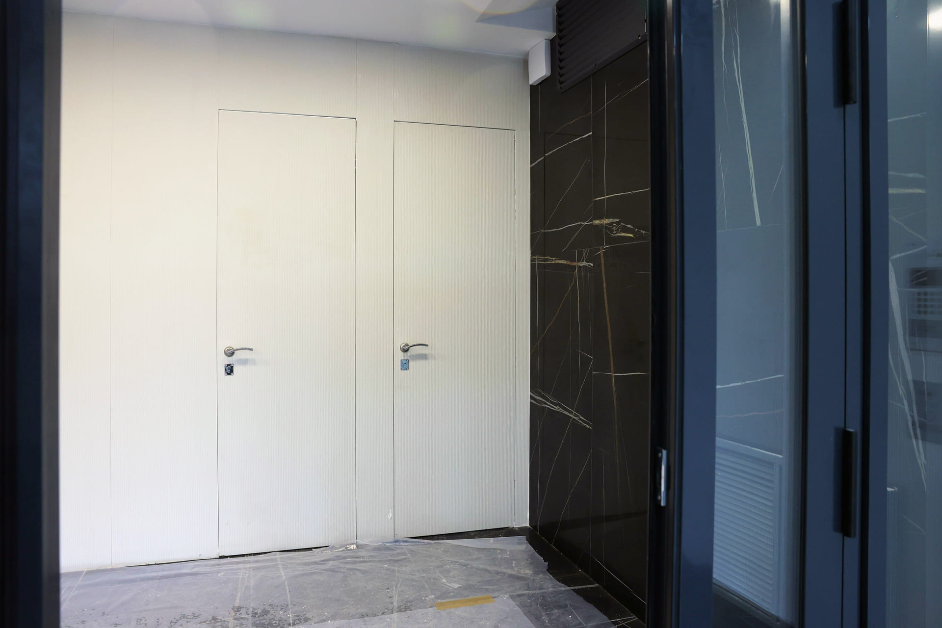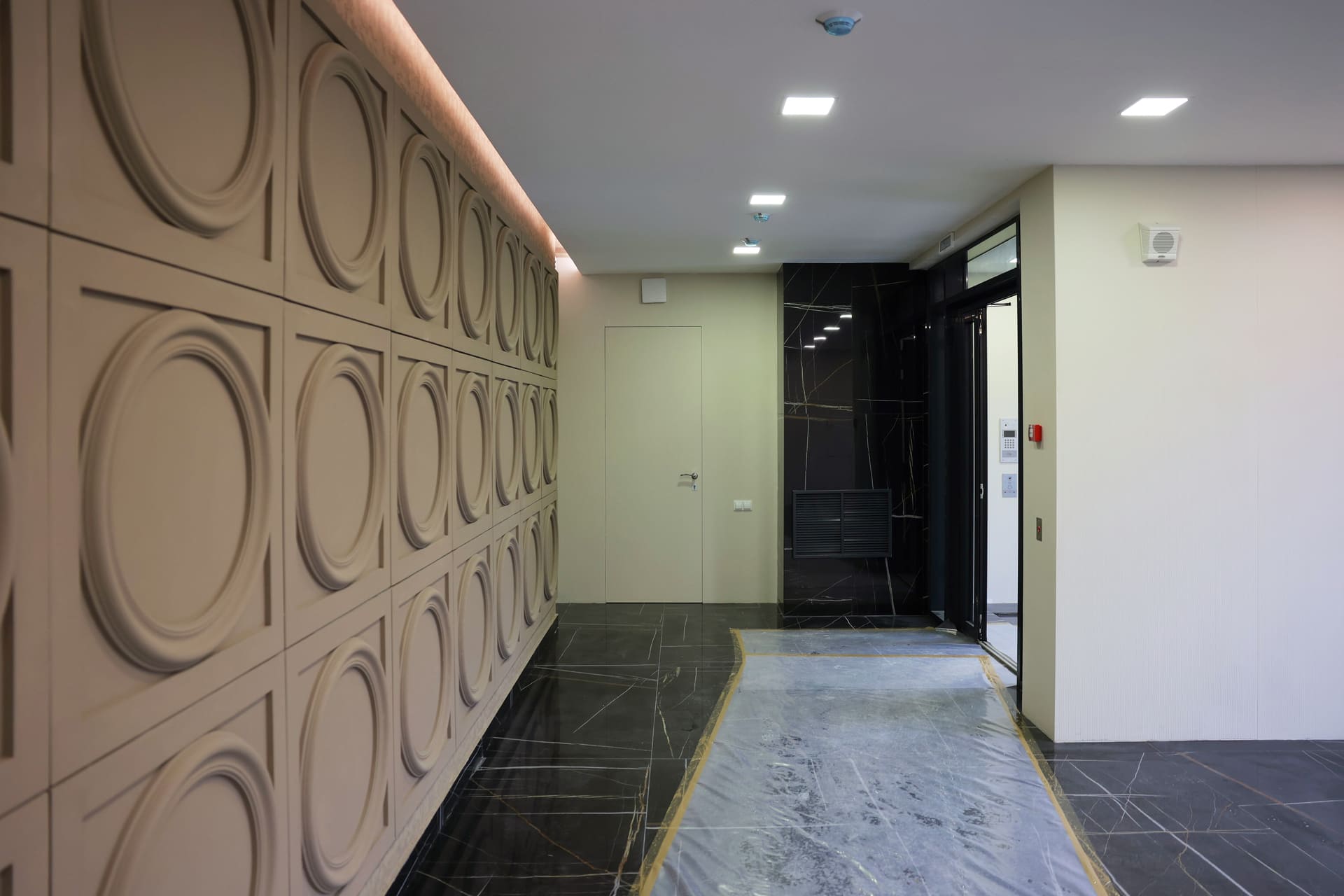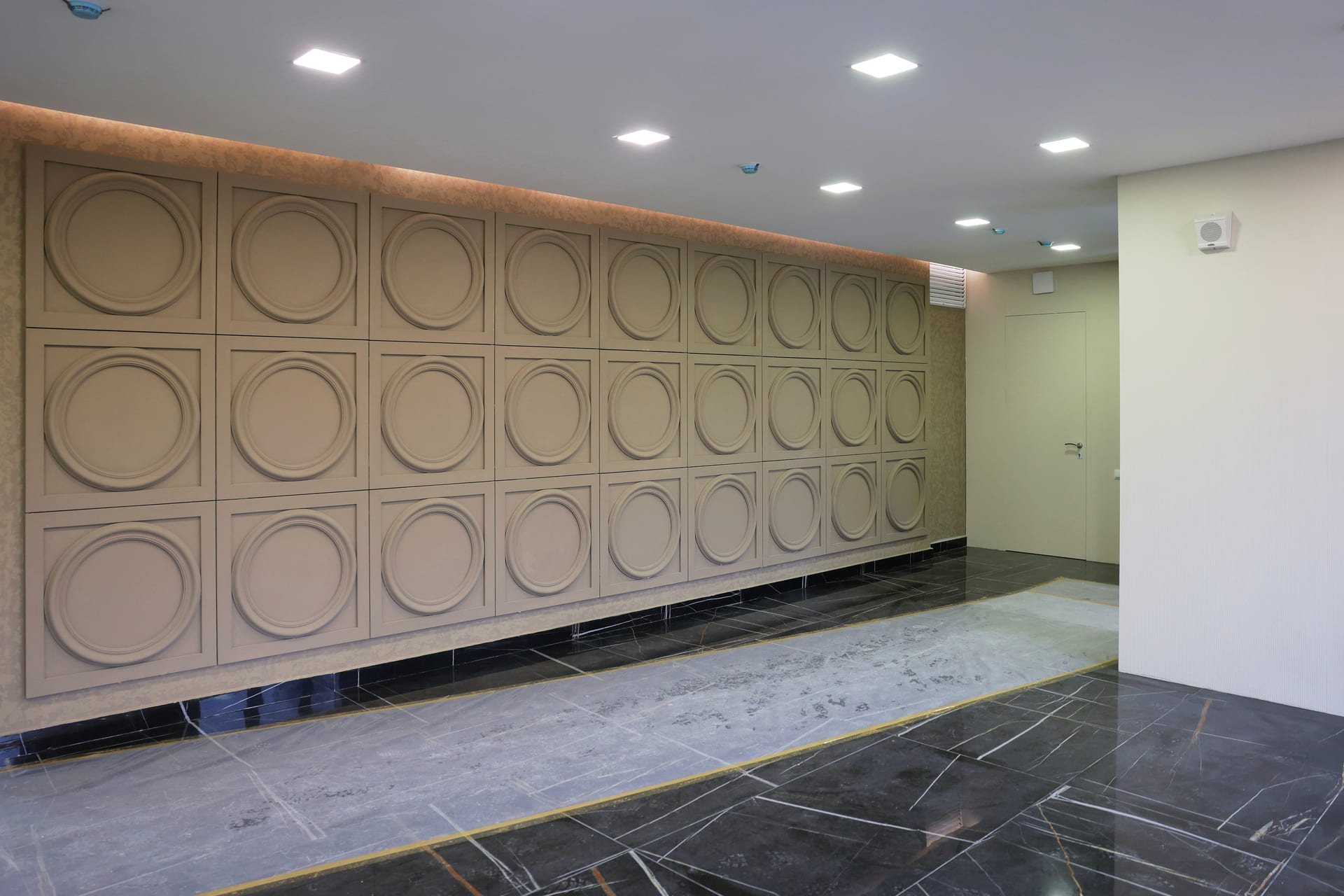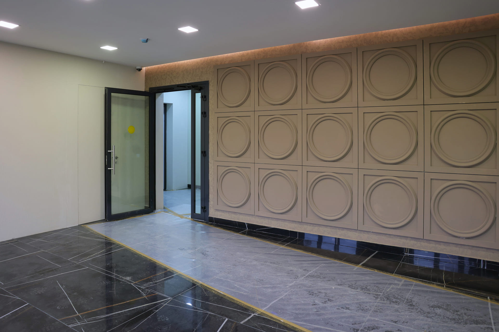Просторные холлы с высокими потолками, витражными окнами и элегантной отделкой создают ощущение легкости и воздушности. Здесь используется крупноформатный керамогранит, декоративные панели и зеркала, а мягкая мебель в зоне ожидания добавляет уют.